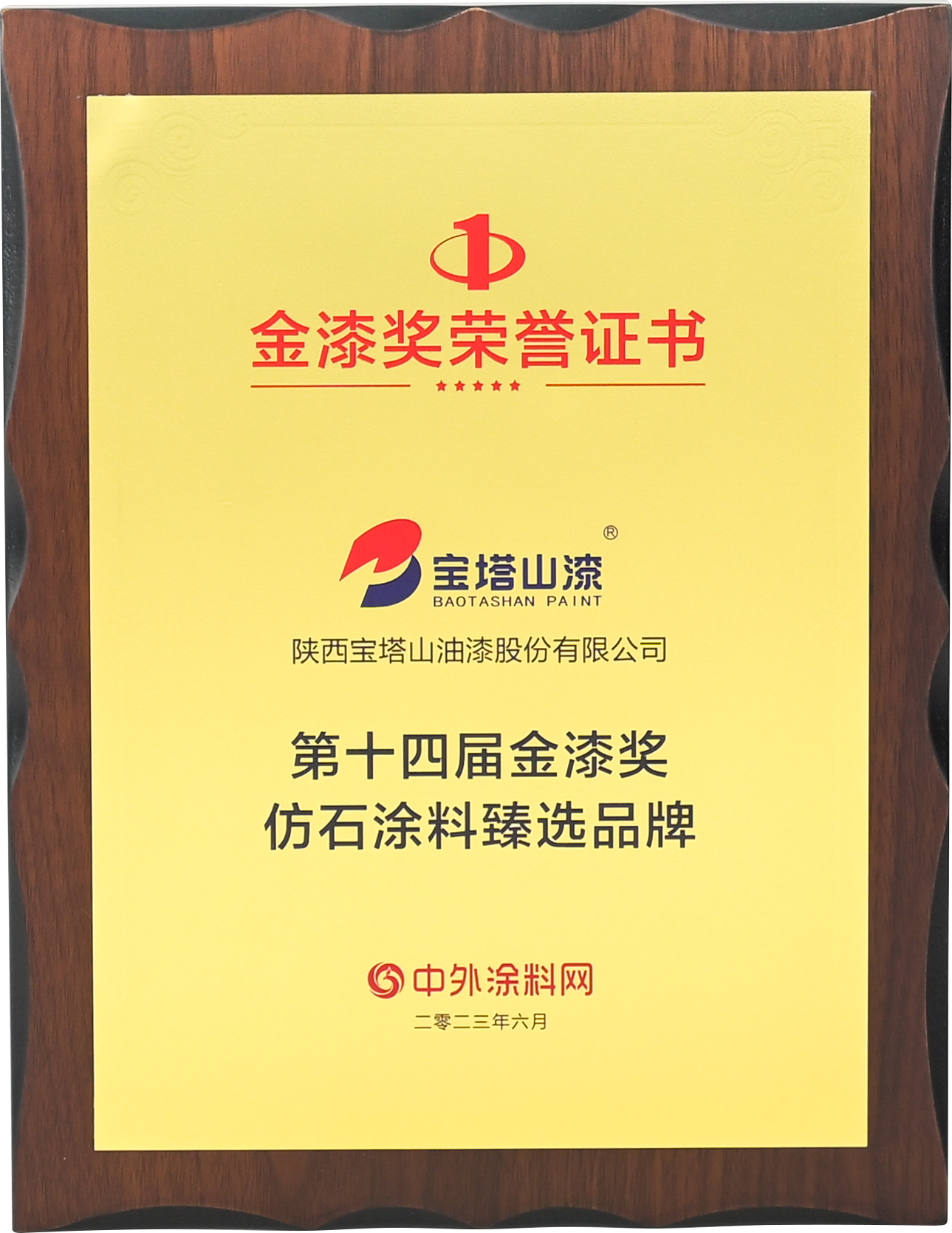2024年5月,寶塔山漆榮獲“第十五屆金漆獎仿石涂料臻選品牌”。